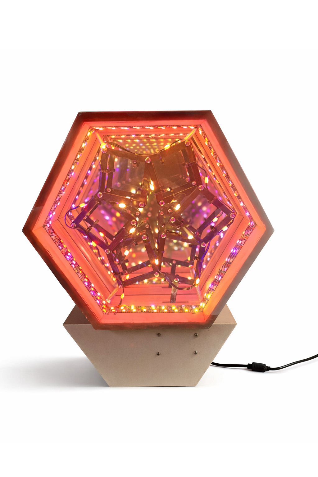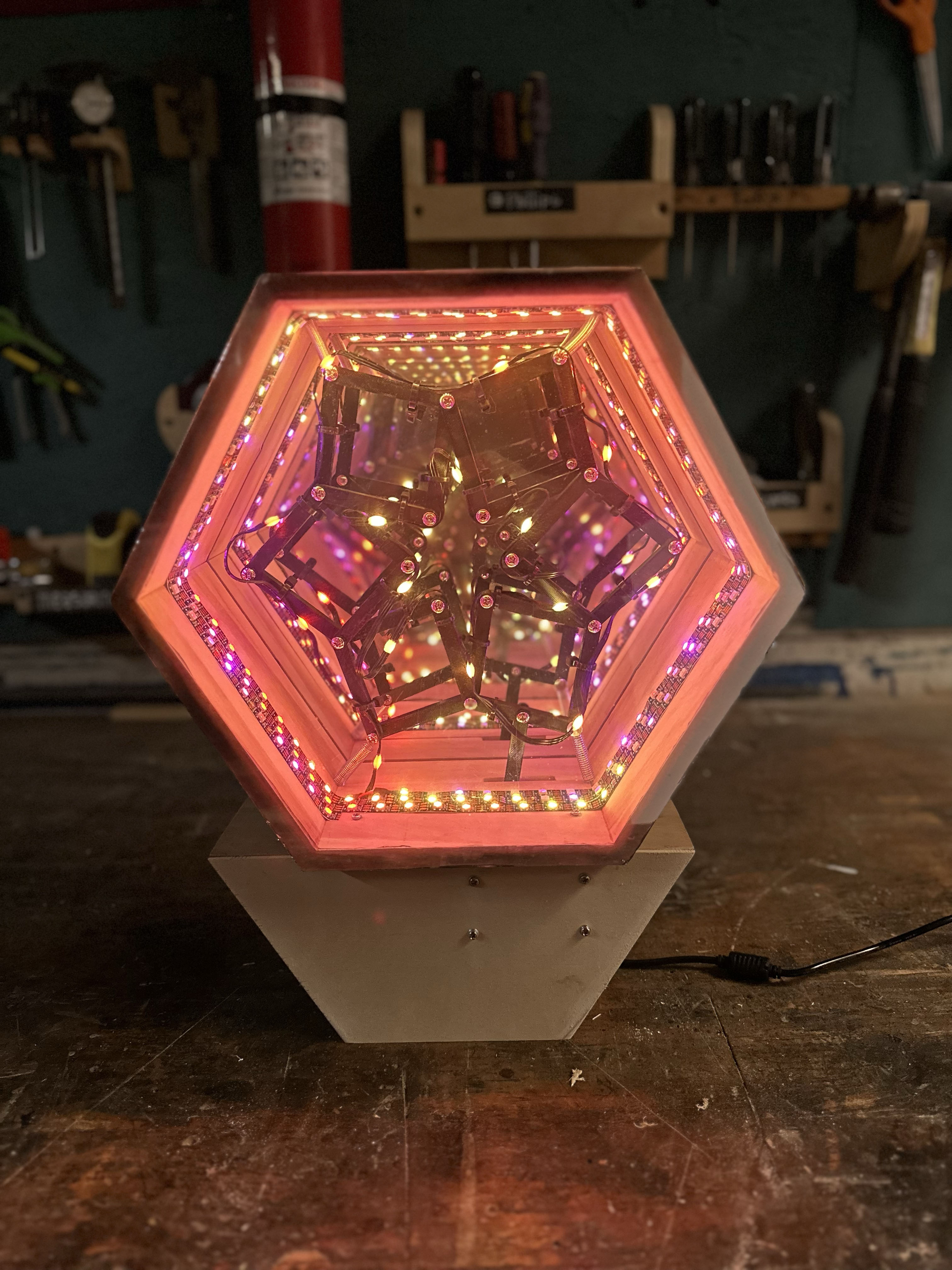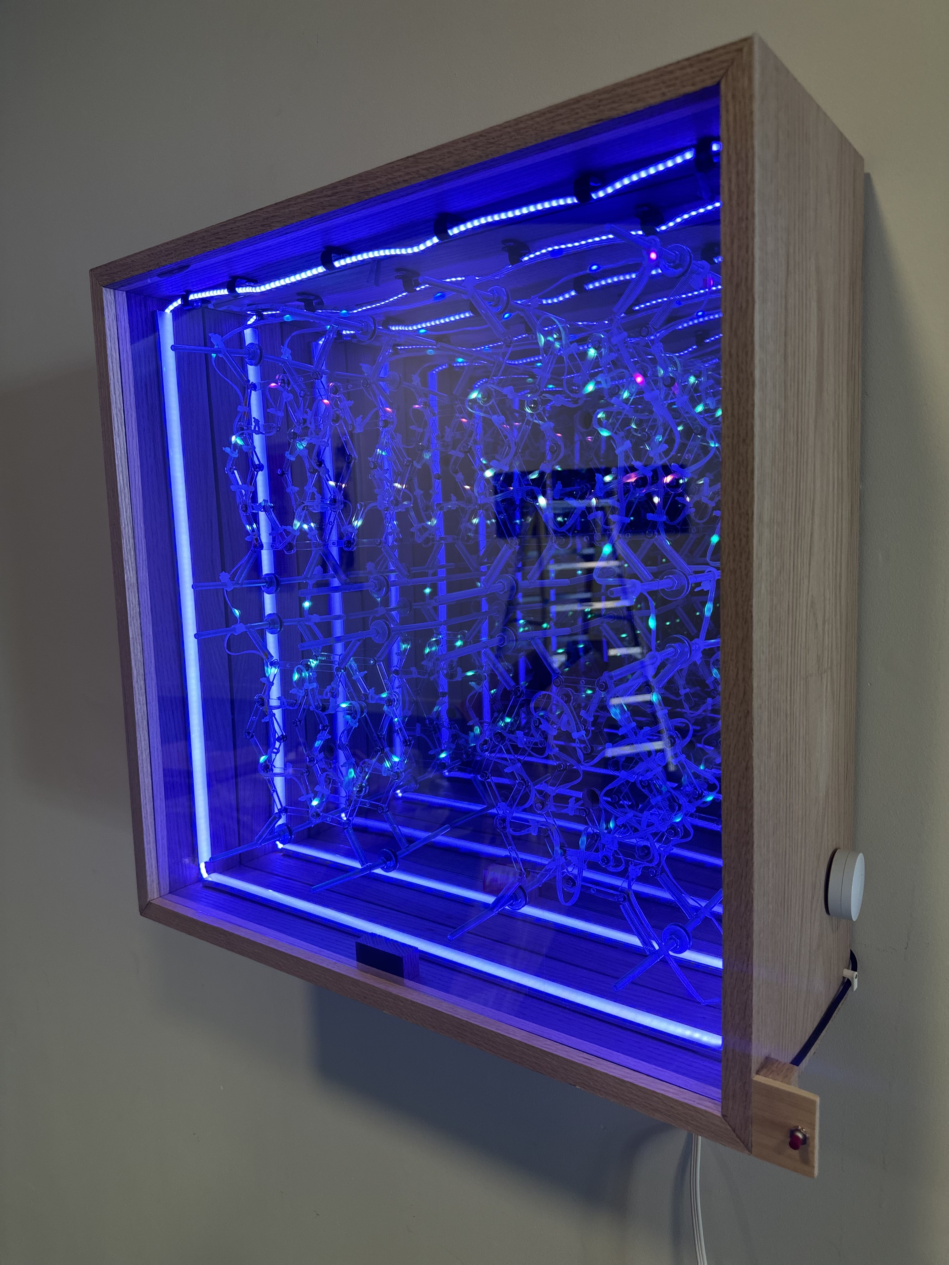 A kinetic sculpture built around an articulated hexagonal Hoberman mechanism inside an infinity mirror enclosure. A hidden linkage and stepper motor expand and contract the form, while dozens of LEDs illuminate a breathing, morphing tunnel of shifting depth. Wood, 3D-printed PLA, mirrors, glass, stepper motor, microcontroller, LED strips.
