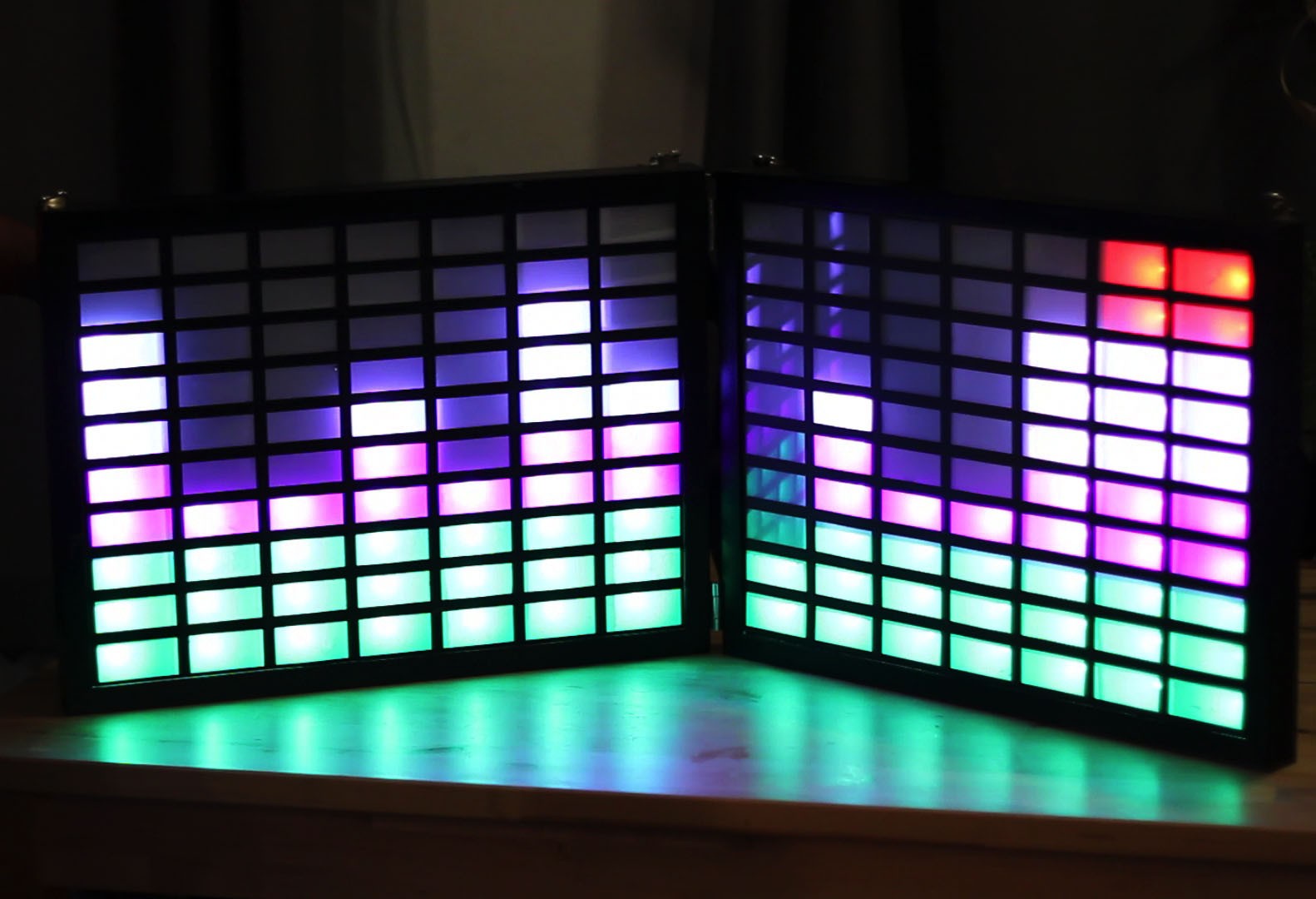 A giant wall-mounted VU meter housed in poster frames, with microphone and line-in audio, adjustable sensitivity, and brightness. Powered by an Arduino and NeoPixels, it translates sound into towering columns of light.
